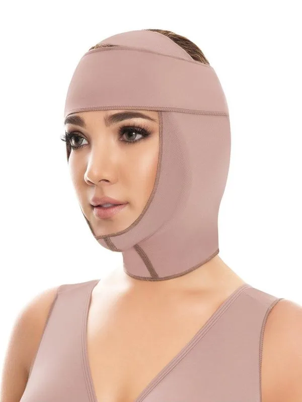 Mentonera postquirúrgica, recomendada para múltiples procedimientos de rostro como, levantamiento de cejas, estiramiento facial, estiramiento de cuello, liposucción (cara, barbilla, cuello), implantes faciales, cirugía maxilofacial, entre otros. Su sistema de ajuste con velcro en la parte superior de la cabeza que permite ajustar el control según tus necesidades. Está elaborada 100% en powernet, con un forro interior de algodón.
